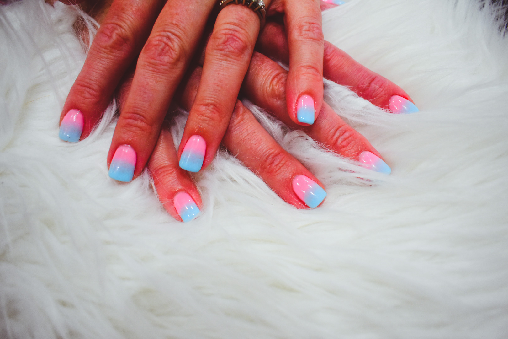 What you need:Base coat Medium Pink lacquerMedium Blue lacquer Sponge applicator Top coat Step 1: Apply a layer on base coat to each nail. Let dryStep 2: Apply 2 coats of the pink nail lacquer to each